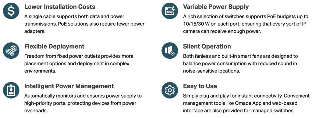 With Extend Mode, PoE supports data and power transmissions up to 250 m away—perfect for surveillance camera deployment in large areas.
